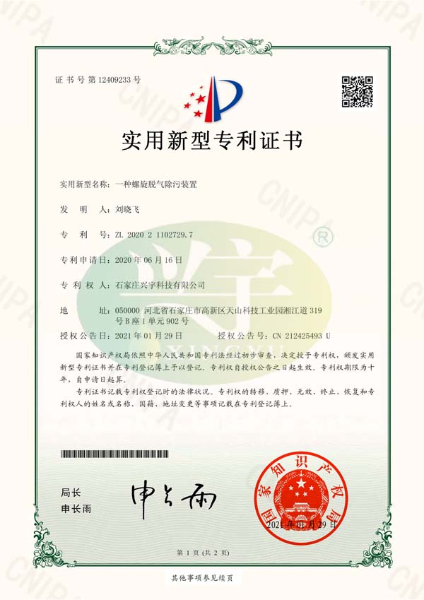 熱烈慶祝興宇科技生產(chǎn)的螺旋脫氣除污裝置獲得新型專利證書